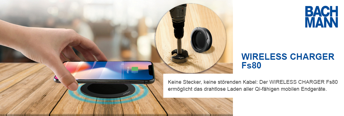 Der WIRELESS CHARGER Fs80 ist ein designorientiertes Produkt zur induktiven Energieübertragung, passend für jedes Möbelstück. Der Charger enthält eine Induktionsspule und verfügt über eine Schnellladefunktion. Er ist kompatibel mit gängigen Qi-fähigen Endgeräten und kann diese standardmäßig mit 5V aufladen. Fast Charging (9V) ist ebenfalls möglich - hierfür wird das Steckernetzteil "Quick Charger" (Art.nr. 934.900) benötigt.